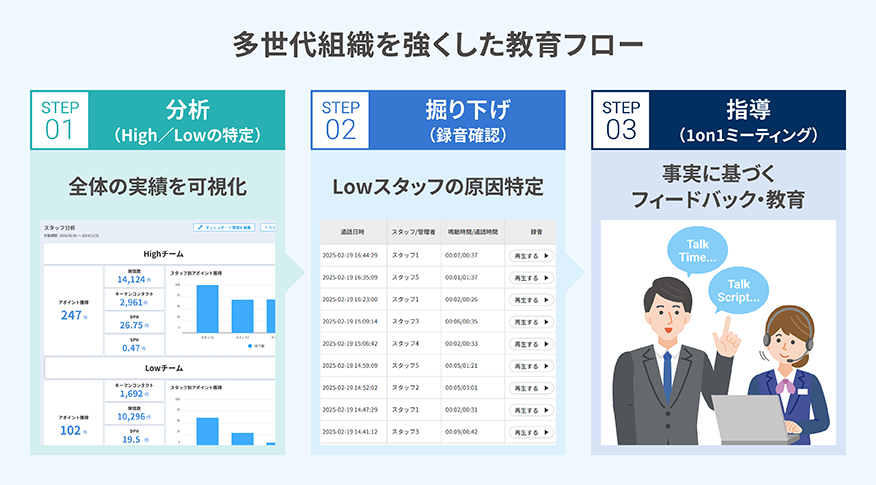 定性的な変化としても、組織に大きな転換が起きています。最も大きな変化は、指導に根拠が生まれたことです。通話録音を確認できるようになったことで、トークに問題があるのか、後処理に時間がかかっているのかなど、問題の所在を具体的に特定できるようになりました。証拠として残る録音が、マネージャーが自信を持って1on1指導をおこなうための土台となっています。アポイント獲得率が高いメンバーのトークを新人に共有するサイクルも機能し、チーム全体のトーク品質の底上げにもつながっています。