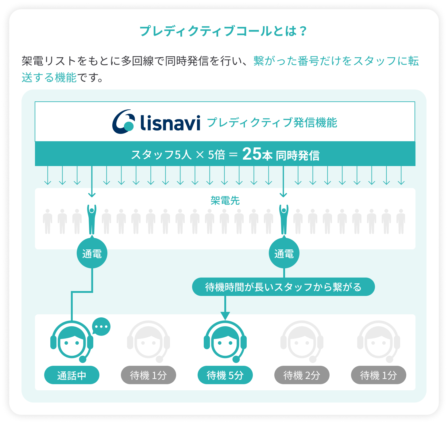 例えば、通電率が20%と予測される場合は待機人数×5倍の回線数で発信をセットすることで、待機スタッフを極力発生させずに通電させ続けることが可能になります。