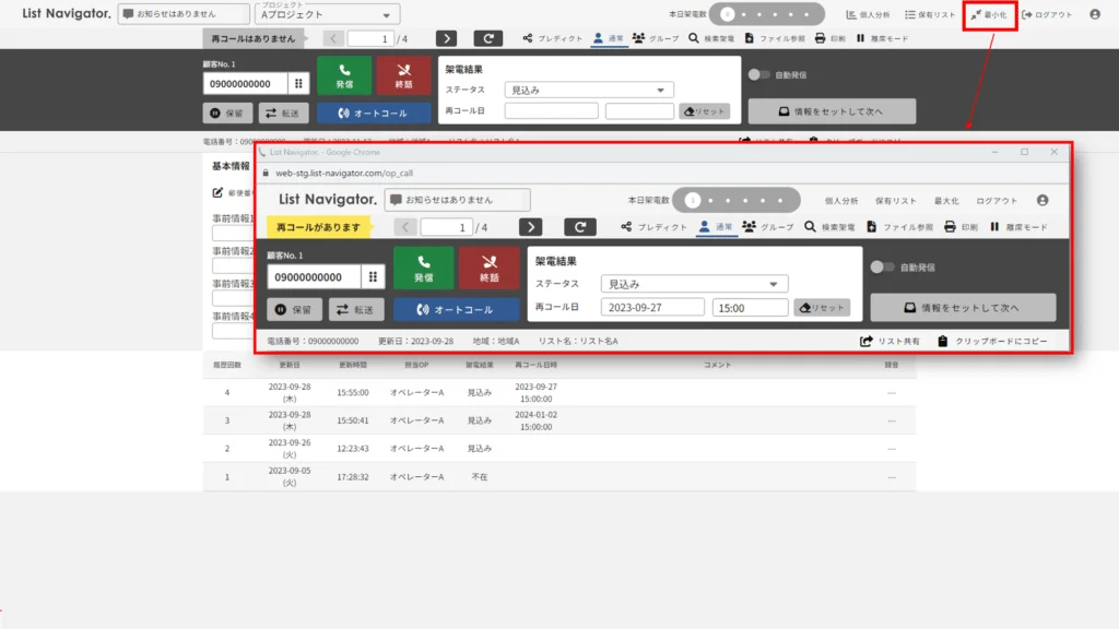 最小化された画面では、リストの基本情報や履歴は非表示され、発信ボタン等の操作テーブルのみが表示されます。