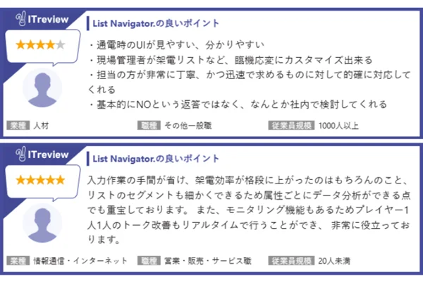 List Navigator.は、5点満点中4.2点といった高評価をいただいております。いただいたコメントを一部紹介いたします。