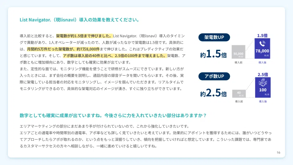 - ・ 発信数が1.5倍、アポ数が2.5倍に